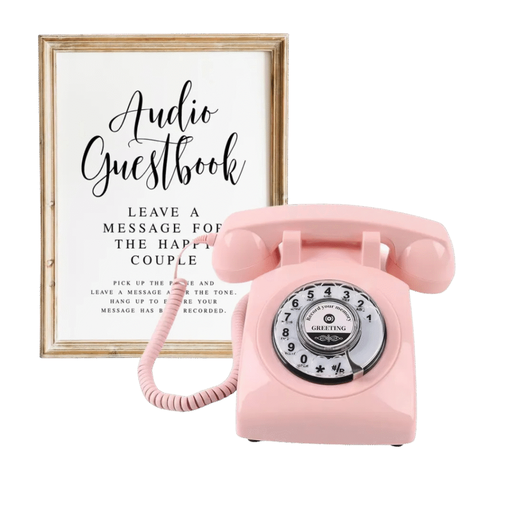 Guests simply pick up a beautifully vintage-style telephone and, after hearing a short prompt, record their well-wishes, memories, or funny messages directly to you. Our retro-inspired audio guestbooks, designed to resemble classic rotary phones, bring a nostalgic charm that fits seamlessly into any wedding aesthetic.
